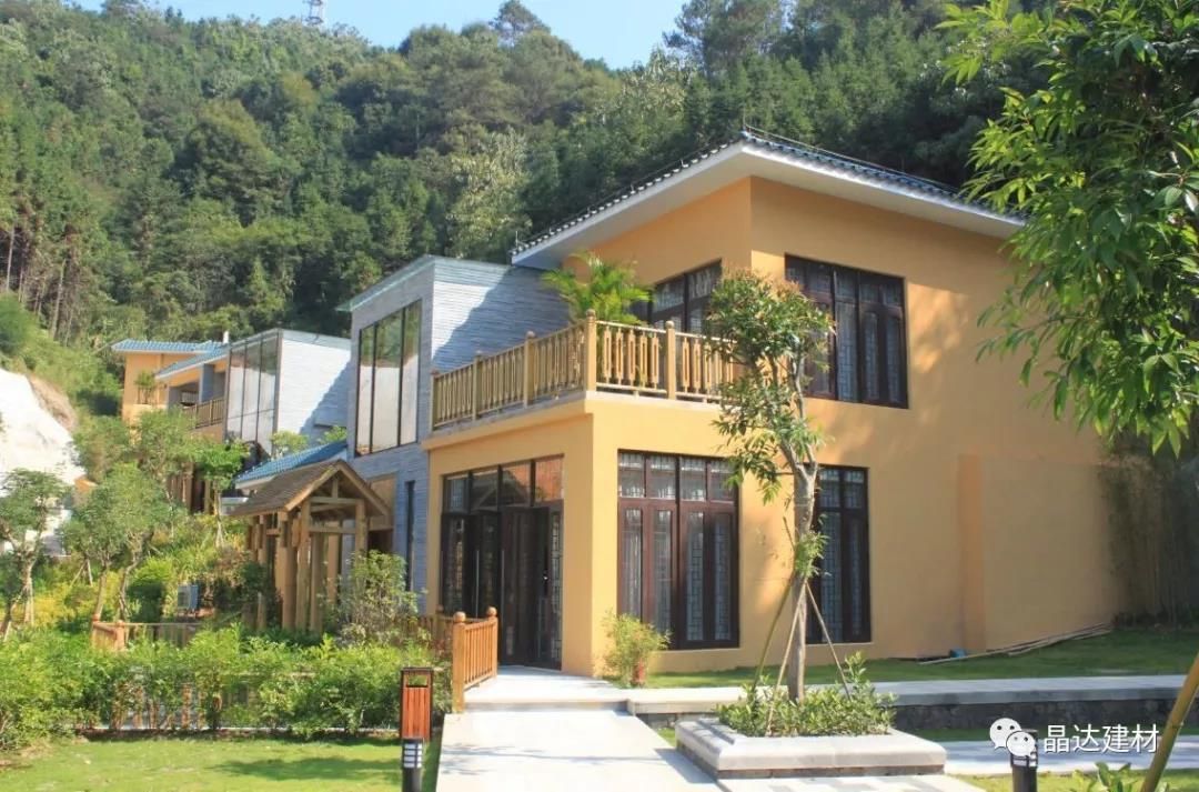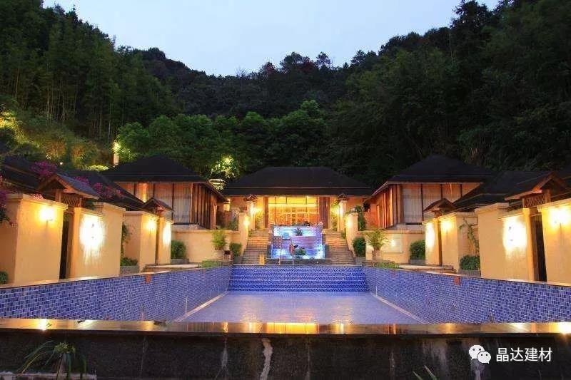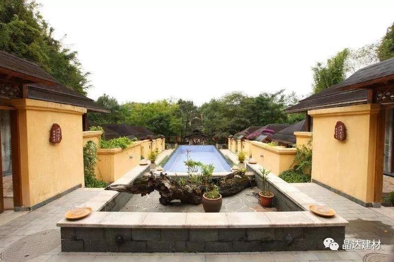除亭臺(tái)與長(zhǎng)廊外,“新西湖”瀝青瓦也因其優(yōu)良的品質(zhì),被大量運(yùn)用于酒店別墅坡屋面中。以其大氣典雅的調(diào)性,與黃色系墻面搭配拼接,彌補(bǔ)了黃色本身過(guò)于羸弱的色彩印象,大大提升了建筑整體的神韻氣場(chǎng)。